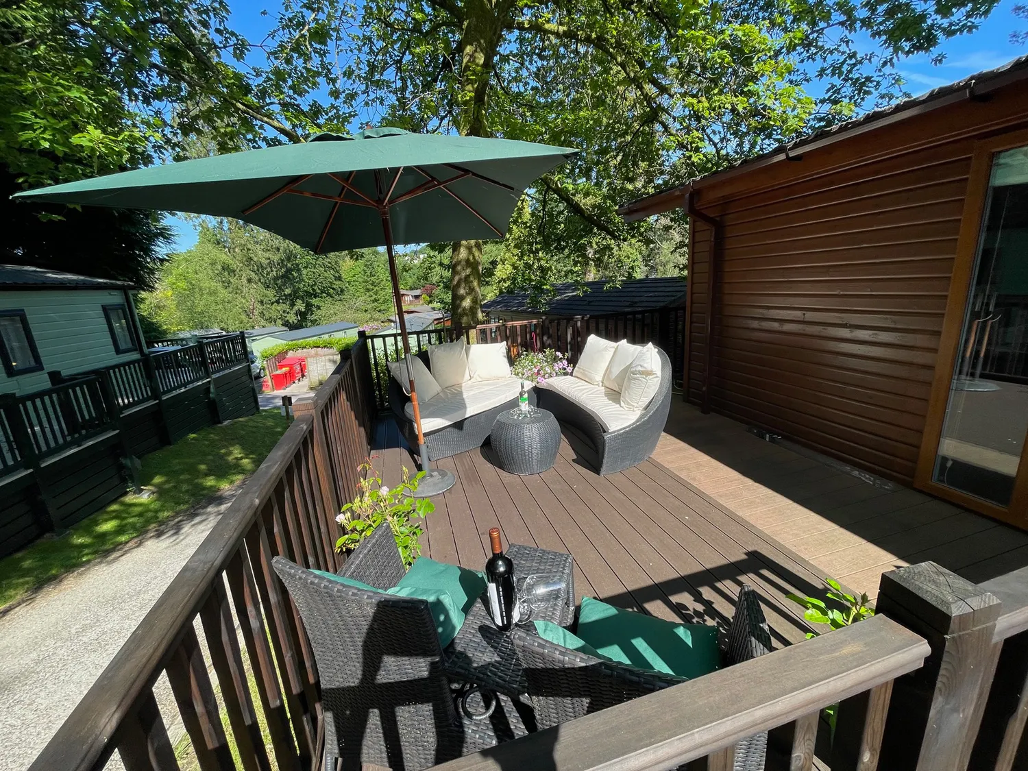 Step inside the lodge and discover a bright and airy open-plan living space, with natural light from wide doors that open directly onto the decked terrace. The lounge offers comfortable sofas and a Smart TV for cosy evenings in, and the kitchen and dining area are fully equipped for your holiday cooking. After a day of exploring, unwind on the decking with a glass of wine in hand, enjoying the gorgeous views of the park and distant lake.
